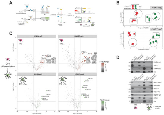 Figure 6. Histone post-translational marks associate with distinct protein subsets during the pluripotent and differentiated states. (A) Overview of the histone tail peptide pulldown experiment. (B) Principal Component Analysis of peptide pulldown experiments with histone H3K4, H3K4me3, H3K27, and H3K27me3 (n = 3). (C) Volcano plots projecting fold-change observed against significance (t-test) for all four experiments. (D) Western blot analysis of selected results from peptide-pulldown experiments. Original Western blot images can be found in Supplementary Figure S1.