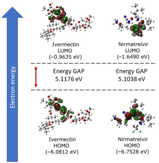 Analysis of the frontier molecular orbitals (FMOs) of Ivermectin and Nirmatrelvir, depicting their LUMOs and HOMOs, and the energy GAPs (eV) between them.