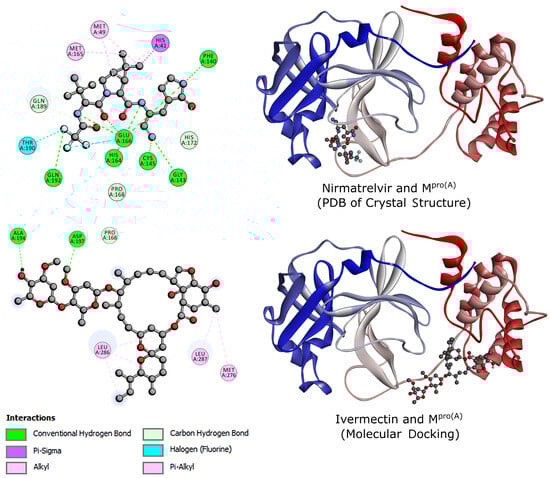 From this perspective, Figure 2 details the ligand–Mpro(A) interactions for the best score pose of the molecular docking. At the top, we present Nirmatrelvir. This complex was obtained from Zhao and colleagues [20]. We observed that the molecule established interactions near the N-terminus of Mpro(A), encompassing methionines 49 and 165 (MET), histidine 41 (HIS), phenylalanine 140 (PHE), glycine 143 (GLY), threonine 190 (THR), cysteine 145 (CYS), glutamate 166 (GLU), glutamines 189 and 192 (GLN), and proline 168 (PRO). On the other hand, at the bottom of this figure, Ivermectin, in the reported best energy configuration, occupied a distinct pocket closer to the C-terminus of Mpro(A), interacting with alanine 154 (ALA), aspartic acid 197 (ASP), leucines 286 and 287 (LEU), methionine 176 (MET), and proline 168 (PRO). Remarkably, while Nirmatrelvir and Ivermectin were bound to separate pockets near the N- and C-termini, respectively, they converged toward the central region. The dominant interactions of Nirmatrelvir involved conventional H-bonds. In contrast, those of Ivermectin were dominated by alkyl and pi-alkyl interactions, showing that Nirmatrelvir interacted more strongly with Mpro(A).