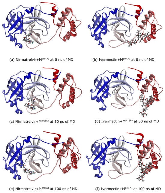 By employing the optimal docking pose (see Figure 2), we examined snapshots at 0 ns (a,b), 50 ns (c,d), and 100 ns (e,f). These depictions reveal a significant disparity in the conformational flexibility: while both ligands consistently maintained their binding to Mpro(A) throughout the simulations, Nirmatrelvir exhibited a markedly more pronounced conformational variation compared with Ivermectin. The red, black, cyan, blue, and grey spheres represent the oxygen, carbon, fluorine, nitrogen, and hydrogen atoms, respectively.