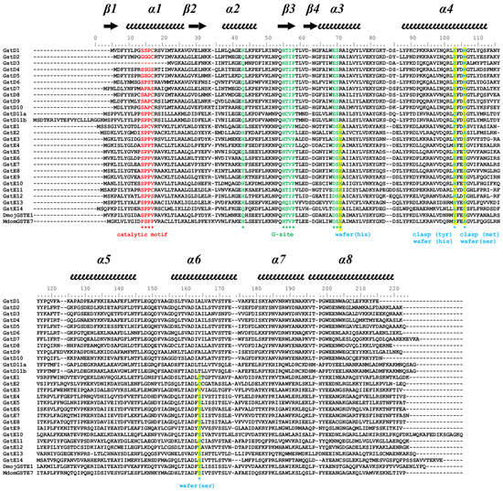 Sequence alignment of Delta and Epsilon GSTs. All known Delta and Epsilon GSTs from Drosophila melanogaster. The GSTE1 from Drosophila mojavensis and GSTE7 from Musca domestica are also represented. The numbering was based on the DmGSTE1 sequence. Secondary structures were inferred from the X-ray structure of DmGSTD2 (5F0G [21]) and are reported above the alignment. Conserved sites are annotated below the alignment.