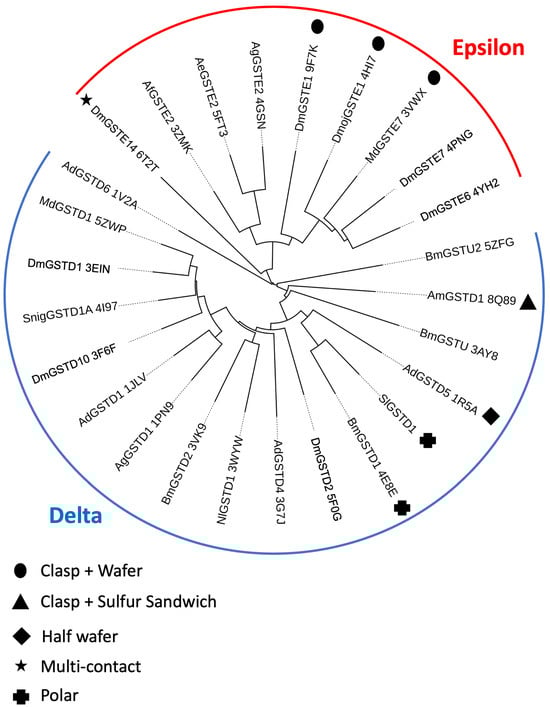 Circular dendrogram of Delta and Epsilon GSTs. The structural alignment and the corresponding structural similarity tree were calculated with the ‘all-against-all’ option implemented on the DALI webserver (http://ekhidna2.biocenter.helsinki.fi/dali/, accessed on 10 March 2024) [37]. The tree was edited with iTOL (https://itol.embl.de, accessed on 10 March 2024). The PDB codes are provided for each structure. Two main branches correspond to the GST Delta (blue) and the GST Epsilon (red). The atypical interface motifs are depicted with black pictures.