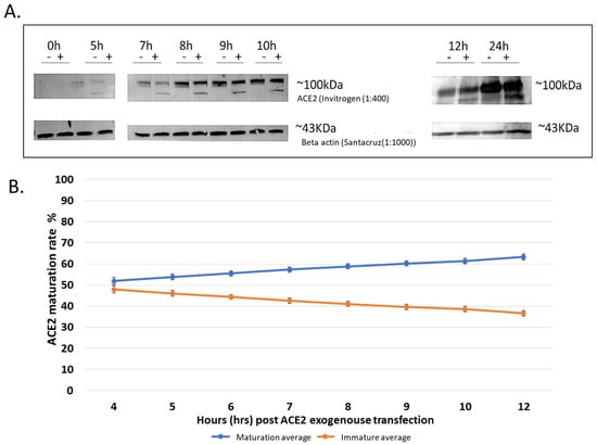 Maturation of exogenously expressed ACE2 over time. Hek293T cells transfected with ACE2 and collected after different time points (0, 5, 7, 8, 9, 10, and 12, then finally 24 h) (A); Representative western blots which resulted from 30 µg of digested cell lysates, loaded on a BioRad precast gel. The enzymatic Endo H digestion cleaves off the carbohydrate side chains from the immature glycoprotein, creating a band shift to a lower molecular weight size band. ACE2 mature and immature bands are detected with (Invitrogen) specific antibodies, showing the two bands at ~120 kDa and ~75 kDa. To control for variations, including loading variation, we always included a control group of samples processed in parallel with the samples for the tested drug. In addition, to control for the loading, the level of ACE2 maturation is always in relation to the total expressed ACE2. Beta-actin was used as a loading control. Original images can be found in Supplementary Materials. (B) showing a trend line over time. Experiments were conducted three times independently, and the graph shows the average of three replicas; quantification of bands for ACE2 at different hrs-post-trans (hours post-transfection) was done using ImageJ.