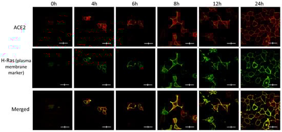 We wanted to further confirm ACE2 maturation by detecting its plasma membrane localization over time, as determined by confocal immunofluorescence microscopy, as a qualitative indicator of its maturation (Figure 2). Obviously, there was no expression of ACE2 or GFP-H-Ras (used as a plasma membrane marker) at the zero time point, but they both were clearly visible at the 4 h time point and beyond. The majority of the two proteins appear to co-localize at the plasma membrane within hours of co-expression. However, at the 4 h time point, some of the ACE2 seemed to be more intracellular, whereas the GFP-H-Ras was largely located at the plasma membrane.