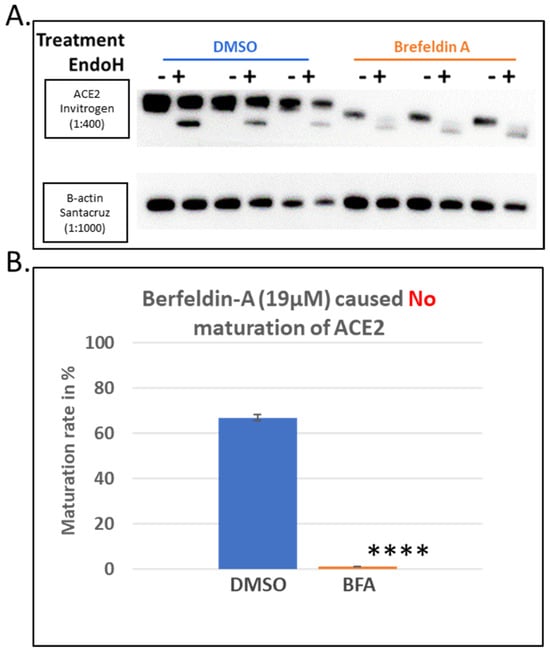 As a positive control for the total inhibition of ACE2 maturation, we used Brefeldin A (BFA), a well-established and drastic inhibitor of protein trafficking from the ER to the Golgi complex. This treatment showed total inhibition of the ACE2 protein maturation as indicated by the absence of the higher molecular weight 120 KDa band on SDS-PAGE gels and the quantitative presence of the lower molecular weight ~75 KDa band, which is presumably the immature protein (Figure 3A). This was confirmed by the quantitative cleavage of its N-glycans side chains, leading to a complete shift to a lower molecular weight protein band (Figure 3A). The level of maturation of ACE2 in cells treated with BFA was compared to those treated with DMSO. The latter showed >60% maturation within the 8 h of expression post-transfection, while the BFA treatment, as expected, showed no maturation at all (Figure 3B).