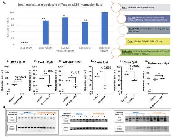 Small molecular modulators of protein trafficking and transport usually exhibit general effects. Figure 4A shows the effects of some selected modulators in a bar graph in comparison with BFA, which shows a complete blockage of ACE2 maturation. Exo1 inhibits ER to Golgi trafficking without affecting the exosomal compartments [29]. We tested the effect of this compound at 20 μM on ACE2 maturation, and it showed a moderate but significant decrease in the amount of mature ACE2 (Figure 4A,C). Similarly, AG1478, which selectively targets the cis-Golgi without affecting the endosomal compartment [30], caused a significant reduction in ACE2 maturation (Figure 4D). Similar results were also obtained with Casin at 8 and 5 μM (Figure 4E and Figure 4F, respectively); Casin is a Cdc42 GTPase inhibitor affecting Golgi to plasma membrane trafficking [31]. On the other hand, Berbamine, an inhibitor of the TRPMLs-mediated transport causing the inhibition of ACE2 endolysosomal trafficking [32], did not show any effects at the tested concentration (Figure 4G).