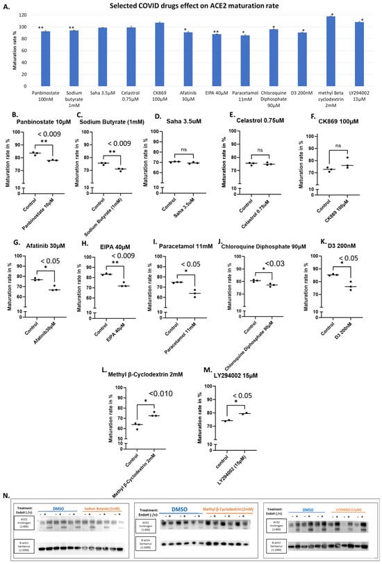 Selected COVID-19 drugs and their effects on ACE2 maturation. HEK293T cells transfected with WT-ACE2 with ViaFect transfection reagent, then 2 h post-transfection cells were treated with varying final concentrations as indicated on the x-axis and then incubated for another 6 h. Control groups were processed alongside their respective treated groups and were processed by the same steps and at the same time. Maturation levels were determined by calculating the quantities of the two bands in each lane. (A). A bar graph shows the average maturation level of each group, following the equation in the methods section. All maturation levels were normalized against the control group. (B–M). Maturation levels for both treated and control groups are displayed as individual readings and plotted with the mean difference tested for significance using GraphPad. (N). Western blots showing either Sodium Butyrate (1 mM), methyl Beta cyclodextrin (2 mM), or LY294002 (15 μM) and compared against the solvent-alone control (DMSO) group, all were harvested 6 h post-treatment. N = 3. Original images can be found in Supplementary Materials. Bands were quantified using ImageJ software. Statistics: unpaired two-tailed student t-test (Welch’s t-test) was applied; ** (p value < 0.055), * (p value ≤ 0.05) and ns: not-significant.