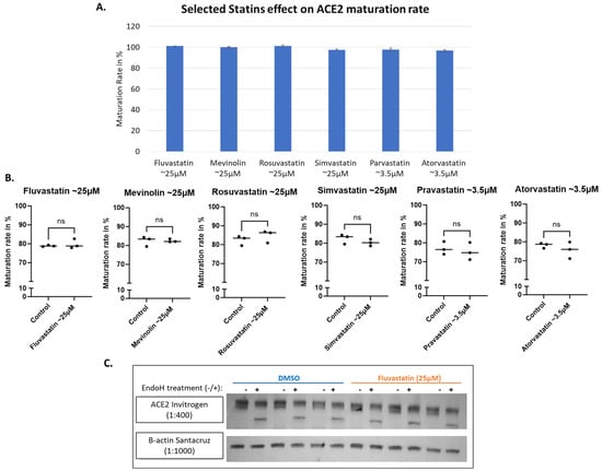 Selected group of statins all show no significant effect on ACE2 maturation. HEK293T cells transfected with WT-ACE2 with ViaFect transfection reagent (Promega, cat #E4981), then 2 h post-transfection cells were treated with varying final concentrations of statins as indicated on the x-axis then incubated for another 6 h. (A). A bar graph shows the average maturation level of each group, following the equation in the methods section. All maturation levels were normalized against the control group. (B). Maturation levels for both treated and control groups are displayed as individual readings and plotted with the mean difference tested for significance using GraphPad. (C). Western blot showing Fluvastatin (25 μM) compared against the solvent alone as a control (DMSO) group. All were harvested 6 h post-statin treatment. N = 3. Original images can be found in Supplementary Materials. Bands were quantified using ImageJ software. Statistics: unpaired two-tailed student t-test (Welch’s t-test) was applied; ns: not-significant.