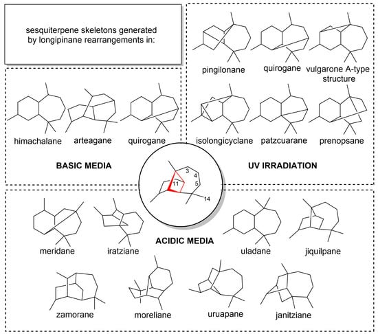 Sesquiterpene skeletons generated by longipinane rearrangements in acidic, alkaline and photochemical conditions.