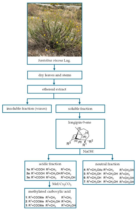 Santolina viscosa Lag. was collected in Los Yesares de Tabernas (Almería, Spain). Dry leaves and stems (approximately 700 g) were extracted by immersion in diethyl ether at room temperature for 24 h. The crude extract (approximately 70 g) was enriched in longipin-9-enes, being seven the major compounds (Figure 2). Fractionation by RRE with alkaline aqueous eases separation of three are carboxylic acids (1a–3a), subsequently methylated (1–3), and also, four are compounds exclusively with hydroxyl groups (4–7). Thus, this plant constitutes an excellent molecular factory toward isolation of large amounts of these compounds in pure form, except for 3, which was obtained as an inseparable mixture with its isomer 2. The Δ9-longipinenes isolated in this study turned out to be the same compounds isolated from this same species that Barrero et al. described between 1994 [20] and 2000 [21].