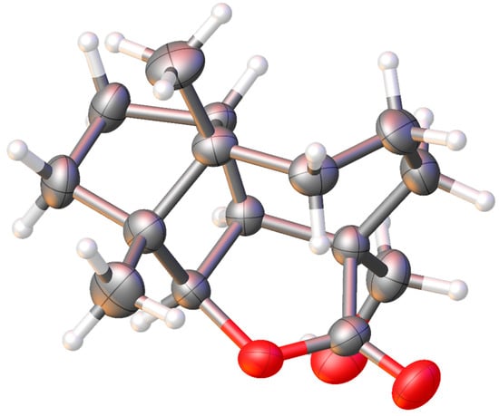 The formation structure of longibornane 13 has similar spectroscopic characteristics as 12, except for a primary hydroxyl group (δ 3.55, d, J = 8.4 Hz, H14a); δ 3.33 (d, J = 10.2 Hz, H14b) geminal to the acyl group. The O-H stretching observed in the infrared spectrum at 3399 cm−1 and the C=O stretching at 1730 cm−1 confirm the presence of the hydroxyl group and lactone group in the structure. The HRESIMS data of 13 establish their molecular composition as C15H22O3 with an [M+H]+ ion at m/z 251.1648 (calculated as 251.1647 for C15H22O3H+). It was obtained as colorless crystals and subjected to X-ray diffraction (Figure 4). Crystal structure and least squares refinement were performed with ShelX [23,24,25]. Its absolute configuration was established by calculating the Flack parameter (Supplementary Materials). Thus, its structure and stereochemistry are confirmed. Crystallographic data have been deposited with the Cambridge Structural Data Centre as supplementary publication number CCDC 2363257.