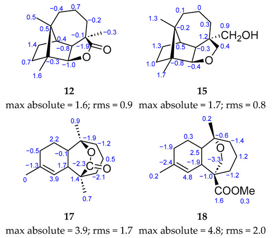 The structures of compounds 12, 15, 17, and 18 are shown in Figure 5 along with the deviations of the calculated chemical shift values from the experimentally obtained values for each carbon (calculated value—experimental value). The largest of these values is shown at the bottom of each structure as a maximum absolute term, alongside the rms (root mean square) value. Both the maximum absolute value and the rms value are acceptable for the four compounds, thus indicating an appropriate fit. This confirms the proposed structures for 12, 15, 17, and 18 (Table 2).