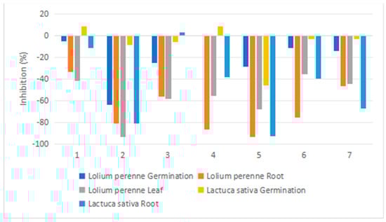 The effect of the compounds 1–7 on L. perenne and L. sativa are shown in Figure 7. Compound 2 strongly inhibited the germination of L. perenne (81% inhibition) over the course of 168 h of experimentation. Most of the tested compounds inhibited root and leaf growth in both species, with 5 being a potent inhibitor of root growth of both species (93% inhibition), 2 inhibiting the roots of both species (81% inhibition) and the leaves of L. perenne (93% inhibition), and 4 selectively inhibiting L. perenne roots (86%). Therefore, these compounds are promising leads for the production of effective new herbicides.