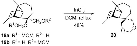 On the one hand, when the isomeric mixture 19a–19b obtained from the partial protection of the hydroxyl groups with MOM was treated with InCl3, compound 20 was formed. The formation of a new six-membered ring is justified by the nucleophilic attack of the hydroxyl group on the methylene of MOM, causing the loss of the protecting group in the form of a leaving group (Scheme 1).