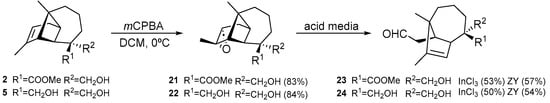 On the other hand, longipinenes 2 and 5 were treated with mCPBA to stereoselectively yield the corresponding epoxides (21–22). Epoxide ring opening on 21–22 was attempted under acidic conditions using InCl3 and zeolite Y-CBV720. Two new rearranged compounds were obtained with a skeleton known [22], the secolongibornane aldehyde (23–24) (Scheme 2).