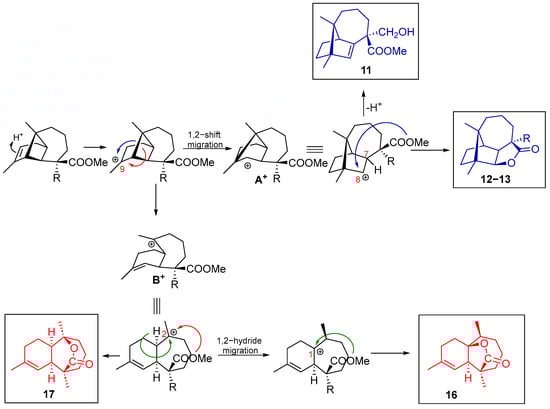 From the intermediate A+, upon loss of the proton at C7, the Δ7 double bond of longibornene 11 is formed. The formation of longibornanes 12–13 occurs from the carbocation at position C8 prone to form a lactone ring by the attack of the ester group at C15 with concomitant Me elimination thanks to the anion from the catalyst. Furthermore, the generation of the B+ intermediate has two possible alternatives: 1,2 hydride migration followed by the subsequent attack of the ester group to form a γ-butyrolactone with a himachalane-based skeleton (16), or the direct attack of the ester group on the carbocation at C2, generating a δ-valerolactone with a himachalane-based skeleton (17).