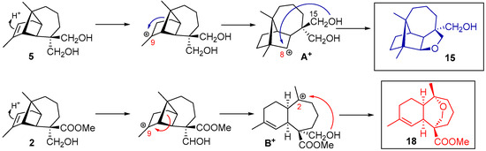 - Armenta-Salinas, C.; Guzmán-Mejía, R.; García-Gutiérrez, H.A.; Román-Marín, L.U.; Hernández-Hernández, J.D.; Cerda-García-Rojas, C.M.; Joseph-Nathan, P. Novel Sesquiterpene Skeletons by Multiple Wagner–Meerwein Rearrangements of a Longipinane-1,9-diol Derivative. J. Nat. Prod. 2019, 82, 3410. [Google Scholar] [CrossRef]