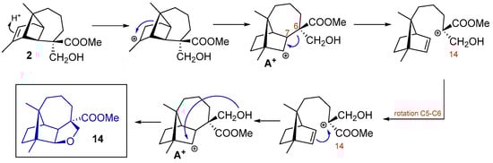 The formation of cyclic ethers follows a similar mechanism as that proposed to the lactones. Compounds 15 and 18 are formed through intermediates A+ and B+, respectively, with the attack of the hydroxyl group on the generated carbocation. The hydroxyl group located at C15 is responsible for cyclization through the front side of the molecule at 15 and the hydroxyl group located at C14 is responsible for cyclization through the back side of the molecule at 18 (Scheme 4). From natural longipinene 2, the formation of a cyclic ether with a longibornane-based skeleton also occurs (Scheme 5). After confirming the structure 14 through computational calculations, which involve the exchange between substituents C14 and C15, a mechanism is proposed to explain the formation of this longibornane. In this case, the breaking of C6–C7 bond in intermediate A+ origines a carbocation at C6. At this point, a rotation of the C5–C6 carbons occurs, positioning the hydroxyl group at C15, where intermediate A+ is regenerated and then attacked by the hydroxyl group to form 14 (Scheme 5).