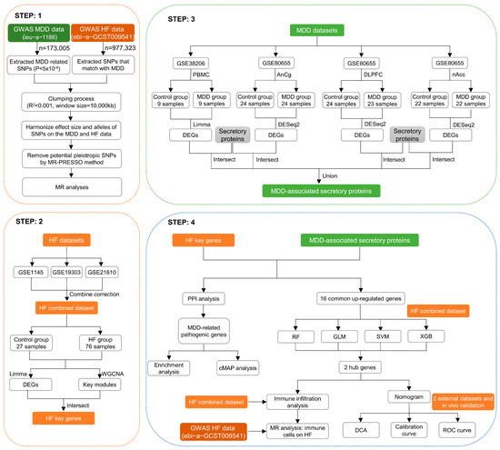 Three microarray datasets relating to the HF and control groups, namely GSE19303, GSE1145, and GSE21610, were retrieved from the GEO database (accessible at https://www.ncbi.nlm.nih.gov/geo/, accessed on 5 January 2024). The raw expression profile datasets of peripheral blood mononuclear cells (PBMCs) (GSE38206) and brain tissues (GSE80655) including anterior cingulate cortex (AnCg), dorsolateral prefrontal cortex (DLPFC), and nucleus accumbens (nAcc) from MDD patients were also obtained from GEO database as well. The integration of HF-related expression profiles was achieved through the application of the “ComBat” function of the “SVA” package in R (version 4.3.1). This process involved the batch correction of three HF-related datasets, resulting in a final compilation of 76 HF samples and 27 control samples. Detailed descriptive information on datasets and samples is shown in Table S1.