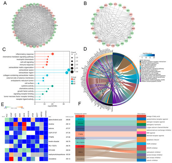 In order to elucidate the prospective pathogenic genes and mechanistic underpinnings in MDD-related HF, the interplay between MDD-associated secretory proteins and HF key genes was compiled using the STRING database. Through the utilization of the MCODE analysis plugin, subsets with scores greater than 10 were pinpointed, where 78 genes were highlighted as MDD-related pathogenic genes implicated in the development of HF (Figure 5A,B). The analysis of GO terms pertaining to biological process (BP) demonstrated that the MDD-related pathogenic genes exhibited a predominant enrichment in the “chemokine-mediated signaling pathway”, “inflammatory response”, and “extracellular matrix organization” (Figure 5C). The results of the molecular function (MF) analysis uncovered that the pathogenic genes displayed a strong association with “cytokine activity” and “chemokine activity” (Figure 5C). The findings of the KEGG pathway analysis unveiled robust associations between the MDD-related pathogenic genes and key pathways, namely “cytokine–cytokine receptor interaction” and “PI3K-Akt signaling pathway”. Additionally, these genes exhibited enrichment in fundamental factors contributing to HF, including “fluid shear stress and atherosclerosis”, “hypertrophic cardiomyopathy”, and “dilated cardiomyopathy” (Figure 5D). Furthermore, drug screening analysis of the cMAP database showed that the top 10 compounds with the highest negative scores, namely alpha-linolenic-acid (ALA), nicotine, estrone, CGP-37157, TTNPB, kinetin-riboside, PD-173074, STO-609, methylnorlichexanthone, and vinorelbine, were identified as potential pharmacological agents for the management of MDD-related HF (Figure 5E). The description of the targeted pathways pertaining to these compounds is manifested in Figure 5F.