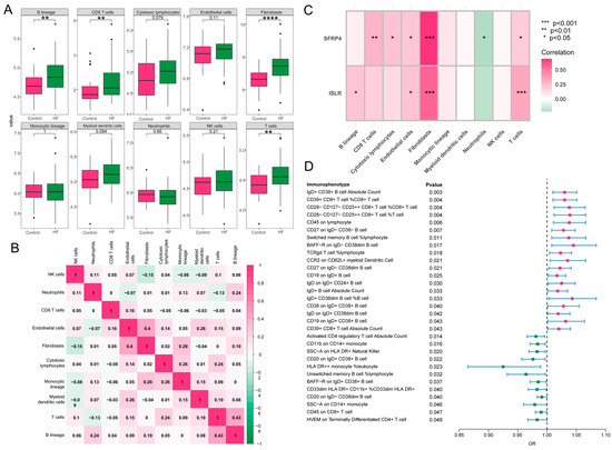 A close association was revealed between immune processes and the function and pathway analysis of MDD-related pathogenic genes in HF. The characteristics of eight subpopulations of immune cells and two subpopulations of stromal cells were derived using the MCPcounter algorithm. Higher proportions of B lineage, CD8 T cells, T cells, and fibroblasts were observed in HF in contrast to the control group (Figure 8A). Furthermore, a significant positive correlation (r = 0.43, p < 0.05) was found between T cells and B lineage during these 10 cell subpopulations, and fibroblasts demonstrated a positive association with endothelial cells (r = 0.4, p < 0.05) (Figure 8B). Notably, as displayed in Figure 8C, the hub genes, ISLR and SFRP4, showed a significant correlation to immune-related cell accumulation (especially T cells and fibroblasts) in HF. Additionally, the MR analysis showed that 31 immunophenotypes were associated with the development of HF, among which IgD+CD38+ B cells and CD39+CD8+ T cells were risk factors, and activated CD4 regulatory T cells were protective factors (Figure 8D).