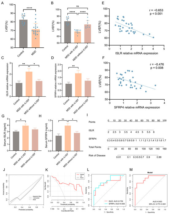 A well-recognized animal model of MDD (CUMS model) was established to enhance the validation of the integrated bioinformatics analysis described earlier. The echocardiographic results unveiled a notable reduction in left ventricular ejection fraction (LVEF) in the MDD group when compared to the control group, signifying decreased systolic function of the heart (Figure 9A). Nonetheless, it was observed that certain individuals in the MDD group did not manifest a reduction in LVEF. Consequently, the MDD group was stratified into two subgroups, namely the MDD with reduced LVEF (rLVEF) group and the MDD without rLVEF group on the basis of the mean LVEF value of rats in the MDD group. A notable observation was made wherein no significant difference in LVEF was evident between the MDD without rLVEF group and the control group. In contrast, rats in the MDD with rLVEF group displayed a marked reduction in LVEF compared with the control and MDD without rLVEF groups (Figure 9B). The findings from an RT-qPCR analysis provided confirmation that two hub genes in the MDD with rLVEF group exhibited an upregulation in the expression patterns in contrast to the control and MDD without rLVEF groups (Figure 9C,D). Subsequent correlation analysis unveiled a significant negative correlation between the mRNA expression of ISLR (r = −0.653, p < 0.001) and SFRP4 (r = −0.476, p = 0.008) with LVEF (Figure 9E,F). In addition, the ELISA detection unveiled an elevated trend in the levels of ISLR and SFRP4 in the serum of the MDD with the rLVEF group when compared to non-HF rats (Figure 9G,H). A diagnostic nomogram model, incorporating ISLR and SFRP4, was developed for the prediction of the probability of rLVEF occurrence based on the in vivo experimental data (Figure 9I). The application of the nomogram in decision-making was found to potentially enhance the accuracy of rLVEF prediction, as indicated by the calibration curves and DCA results (Figure 9J,K). The ROC curve analysis unveiled that the AUC for ISLR and SFRP4 in diagnosing rLVEF reached 0.759 and 0.836, respectively. Notably, the AUC of the nomogram model reached 0.903, indicating its significantly advantageous diagnostic performance (Figure 9L,M).
