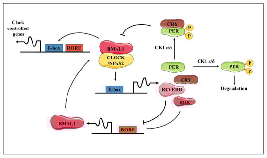 The central circadian clock and the most peripheral clocks throughout the organism share a similar transcriptional architecture which is controlled by conserved, cell-autonomous, and self-sustaining mechanisms []. This molecular timekeeping system is generated by interlocking transcriptional translational feedback loops (TTFL; Figure 1) []. The activators circadian locomotor output cycles protein kaput (CLOCK) and brain and muscle ARNT-like 1 (BMAL1) heterodimerize to recognize E-box motifs, subsequently regulating the expressions of thousands of genes, named clock-controlled genes (CCGs) []. Among these, the repressors periods (PERs) and cryptochromes (CRYs) are translated and assembled into repressor complexes that inhibit the transcriptional activation function of the CLOCK-BMAL1 heterodimers. The activity and proteasomal degradation of repressor complexes are tightly controlled by posttranslational modifications, and their clearance alleviates CLOCK-BMAL1 inhibition for the start of another cycle []. The interlocking of this primary loop with additional activator–repressor pairs, for example, nuclear receptor subfamily 1 group D (REV-ERB) and RAR-related orphan receptor (ROR), allows for differentially phased cycles of transcription according to the distribution of dedicated motifs, including E-box, D-box, and ROR elements, across the genome []. These interconnected auto-regulatory loops, which exhibit an inherent 24 h periodicity, rely on nucleosome dynamics, long-range promoter–enhancer interactions, and a variety of co-factors and chromatin remodelers [,].