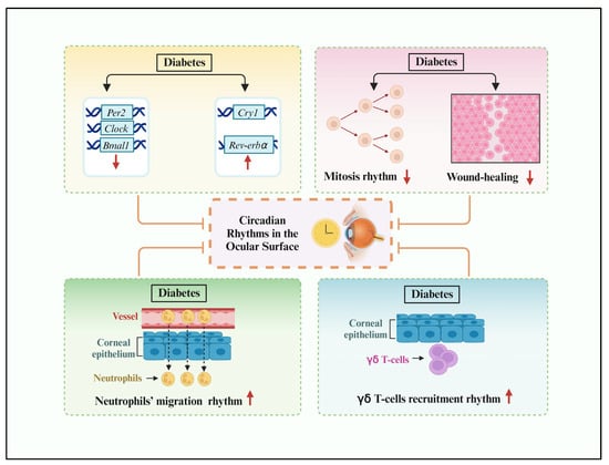 The circadian rhythm of the ocular surface is influenced by diabetes. Diabetes influences the rhythmic expression of five core clock genes (Clock, Bmal1, Per2, Cry1, and Rev-erbα) in the normal murine corneal epithelium. Diabetes attenuated the circadian rhythm of corneal epithelial mitosis with delayed corneal wound-healing. In addition, diabetes also enhanced the emigration fluctuation of neutrophils and the circadian rhythm of γ δ T-cells’ recruitment to the limbal region.
