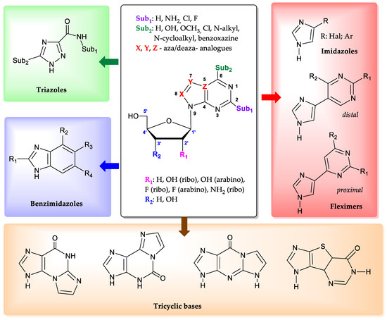 - Matyugina, E.S.; Kochetkov, S.N.; Khandazhinskaya, A.L. Synthesis and biological activity of aza and deaza analogues of purine nucleosides. Russ. Chem. Rev. 2021, 90, 1454. [Google Scholar] [CrossRef]