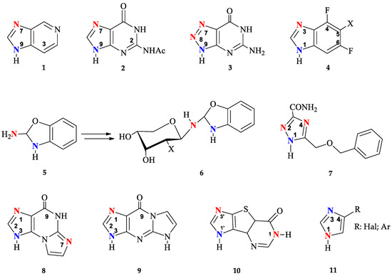 To date, enzymatic transglycosylation of modified heterocyclic bases has been actively used in the synthesis of various new nucleosides, due to the stereo- and regiospecificity of the method [15,41]. However, the principle of regioselectivity may not always be completely achieved: Figure 2 shows examples of heterocycles, the glycosylation of which forms isomers with different positions of the glycoside bond.