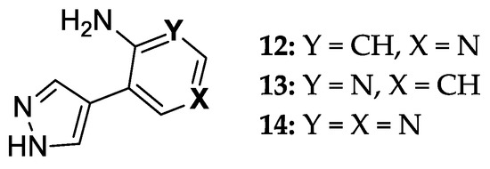 The same amino acid residues are responsible for the binding of 4-(4-aminopyridine-3-yl)-1H-pyrazole 12 and its orientation at the binding site of the enzyme, as well as for its interaction with a natural purine base. The purine base occupies a region formed by Ser90, Met180, Ser203, Asp204, and the hydrophobic Phe159.