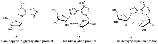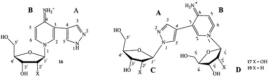 When the pH of the reaction mixture changes from 5–6 (most likely protonation of the amino group) to 8–9 (most likely deprotonation of the pyrazole fragment) (Table 1), resulting in (1) the enhancement of the nucleofilicity of pyrazole nitrogen atoms (from N2 ≈ −0.2590 e to N1(2) ≈ −0.4140 e), and (2) the rate of formation of primary riboside 15 and secondary bis-riboside 17 gradually increases, and after 48 h mixtures of these compounds are formed in a ratio of 35%/2% (pH 5–6) and 65%/13% (pH 8–9), respectively. The conversion of 16 to bis-riboside 17 proceeded synchronously with the formation of the former and reached 13% at pH 8–9 of the reaction medium. Based on these data, it can be assumed that the pyridine riboside 16 is initially formed, which is then ribosylated to bis-riboside 17.