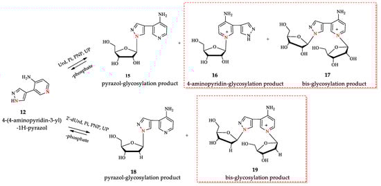 In the case of glycosylation of 4-(4-aminopyridin-3-yl)-1H-pyrazole 12 using recombinant E. coli PNP, several reaction products were obtained. In order to understand the possible pathways of substrate 12 binding and activation in the catalytic center of E. coli PNP, we performed a quantum chemical analysis of the initial structures of the heterocycles and the final nucleotides. We also performed computer modeling of the interaction between base 12 and the active site of the enzyme in order to better understand how the formation of various nucleoside products becomes possible. The results of the study are discussed in detail in this paper.