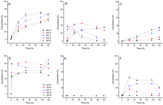 We assume that if pyridinium nucleosides are formed during the transglycosylation reaction, the pH value of the reaction mixture may affect this process. We investigated the effect of pH on the conversion of fleximer base 12 into nucleosides 16, 17, and 19. Due to the fact that the range of enzyme activity lies within the pH range of 5.0 to 9.0, we analyze the reaction under these conditions. The test reaction conditions were as follows: base concentration 2 mM, carbohydrate donor dUrd, or Urd concentration 20 mM. Reactions were carried out in 1.0 mL of 10 mM potassium phosphate buffer at 50 °C. To each reaction mixture, E. coli PNP (1.5 U) and E. coli UP (0.8 U) were added. The reaction was monitored by HPLC for 120 h. The results of ribosylation of base 12 at various pH values of the buffer are shown in Figure 7.