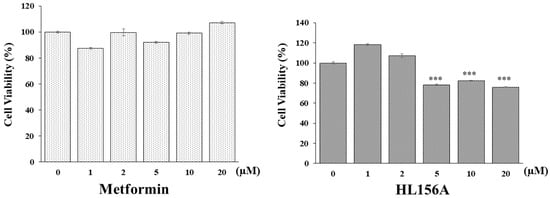 - Lam, T.G.; Jeong, Y.S.; Kim, S.A.; Ahn, S.G. New metformin derivative HL 156A prevents oral cancer progression by inhibiting the insulin-like growth factor/AKT/mammalian target of rapamycin pathways. Cancer Sci. 2018, 109, 699–709. [Google Scholar] [CrossRef] [PubMed]