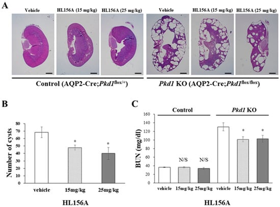 3.4. HL156A Reduces the Number and Size of Cysts and Restores the Kidney Function of the Collecting Duct-Specific Pkd1 KO Mice