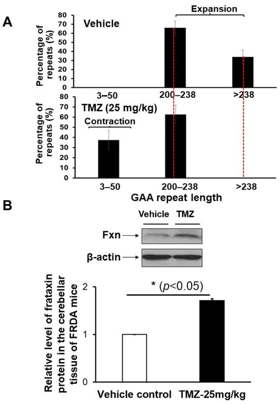 In this study, we provide the first evidence that TMZ results in the large contraction of expanded GAA repeats and a significant increase in Fxn protein levels in FRDA transgenic mouse brain tissue (