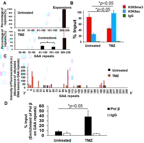 38]. We demonstrate that TMZ-induced alkylated DNA bases in the expanded GAA repeats are removed by the BER pathway through which single-strand DNA (ssDNA) breaks are generated. Subsequently, this results in the formation of TTC loops on the template that are skipped by DNA polymerase β (pol β), thereby leading to the contraction of expanded repeats [