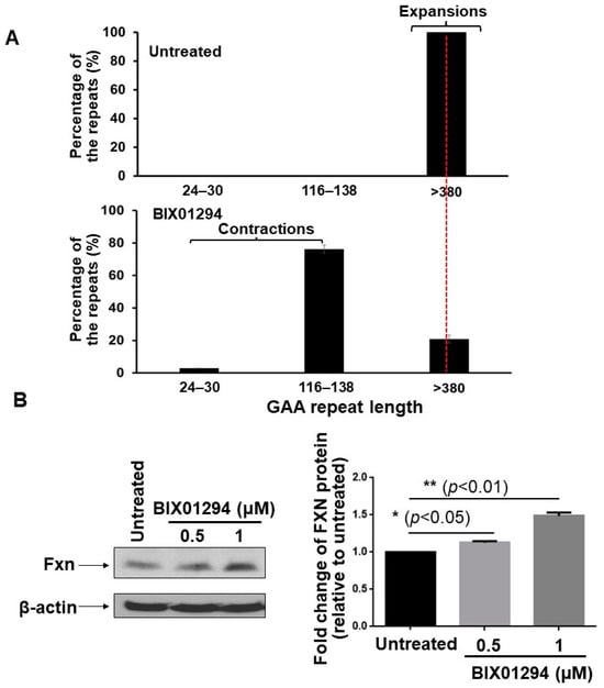 Supplementary Figure S2B). The cells exhibiting pluripotency were detected using an anti-OCT4 antibody (Abcam, ab19857, Waltham, MA, USA). Cells were incubated with the antibodies to the neuronal and pluripotency markers at 1 μg/mL overnight at 4 °C and washed with 0.1% Tween in PBS. Cells were then incubated with a secondary antibody to rabbit IgG-H&L (Alexa Fluor 488, green color, or Alexa Fluor 594, red color) at 1:1000 dilution. The nucleus in cells was stained using DAPI at 0.1 μg/mL. Cell images were acquired using a Leica confocal microscope at a scale of 200 μm. FRDA neural cells were treated with 0.5 μM and 1 μM BIX01294 for 72 h. Untreated cells were used as the control. FRDA neural cells were collected to determine the level of Fxn protein, contraction of the expanded GAA repeats, inhibition of H3K9 methyltransferase activity, the profiles of single-strand DNA breaks on the expanded GAA repeats, and recruitment of DNA polymerase β (pol β) with ChIP.