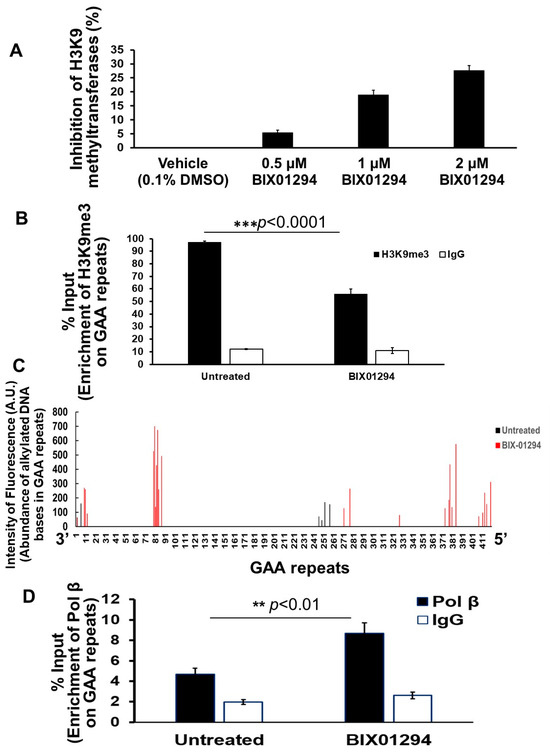49]. Subsequently, this can initiate the BER pathway through which the expanded GAA repeats are contracted. This notion was supported by our results showing that the histone methyltransferase inhibitor BIX-01294 that inhibited H3K9 methylation in FRDA neural cell extracts (