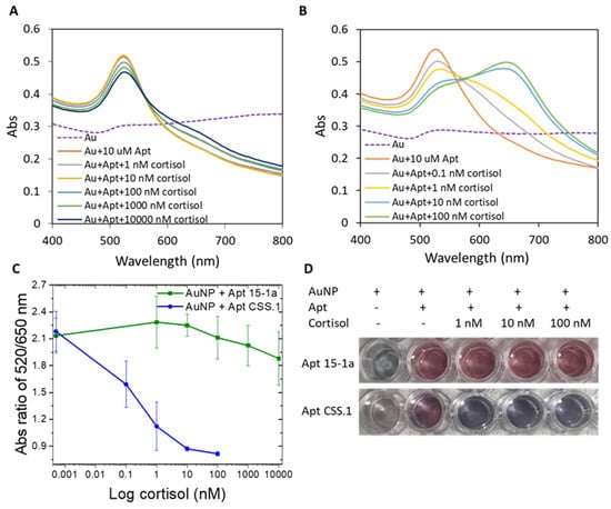Absorbance spectrum of AuNP with (A) Apt 15-1a, before and after cortisol addition (1–10,000 nM) and (B) Apt CSS.1 before and after cortisol addition (0.1–100 nM). (C) The absorbance ratio of A520/A650 of the two cases (A,B) as a function of cortisol concentrations. (D) Photographic images of the AuNP solutions with the two aptamers, before and after cortisol addition (1–100 nM).