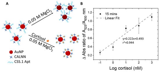 The Au-Apt-CALNN was used to detect cortisol, by exploiting the difference in the colloidal stability of the nanoparticles in a stronger salt condition (MgCl2 added into the reaction solution), where the attached aptamer may adopt a different folding configuration upon cortisol binding (Figure 2A). In comparison to monovalent cations, multivalent metal ions such as Mg2+ have more positive charges and can induce stronger charge screening effects and absorbance changes in AuNPs [60]. We optimized the concentration of MgCl2 and the incubation time that allowed the largest differentiation in the A525/A650 ratio within a reasonable reaction time suitable for on-site detection.