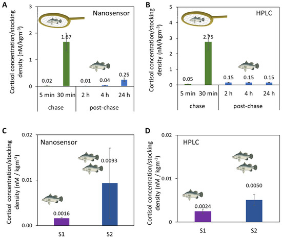 Upon confirmation of its selectivity, we then used the Au-Apt-CALNN nanosensor to detect cortisol from fish tank water samples where the fish were challenged by either handling or increased stocking density. The results were validated with HPLC. First, in the handling stress (chasing and air exposure) experiments, the fish tank water samples were collected at the ends of chasing periods (5 min and 30 min accumulated chasing) and at different time points post-chasing (2 h, 4 h and 24 h) for cortisol quantification by the nanosensor (Figure 4A) and HPLC (Figure 4B). As the number of fish in the tank affected the concentration of cortisol released in the water, the cortisol concentrations in this comparison (and the 2nd stress study below) were normalized to the stocking densities of fish in the tank (2.094 kg/m3). Both the nanosensor and HPLC confirmed the drastic increase of cortisol levels after 30 min of chasing, and the subsequent decrease 2 h post-chase.