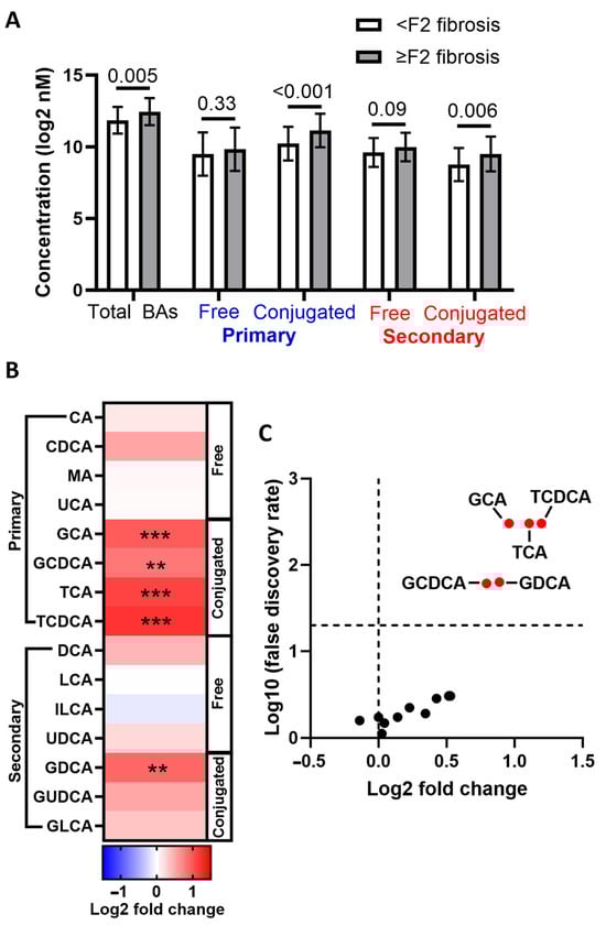 Serum concentrations of several conjugated bile acids are elevated in patients with SLD with vs. without ≥F2 liver fibrosis. (A) Comparison of total, free, and conjugated primary and secondary BAs in patients without (n = 59) vs. with (n = 30) ≥F2 liver fibrosis. (B) Heatmap showing differences in specific BA concentrations (nM) in patients with vs. without ≥F2 liver fibrosis. The y-axis denotes the bile acid. Colour coding depicts log2 fold change in patients with compared to those without ≥F2 liver fibrosis. The brighter the red colour, the more increased the BAs were in patients with ≥F2 liver fibrosis. (C) Volcano plot showing differences in serum BA concentrations (nM) in patients with vs. without ≥F2 liver fibrosis. The y-axis denotes the log10 q-value of an unpaired two-sample Student’s t-test comparing BA concentrations after adjusting for multiple testing using the Benjamini–Hochberg method (FDR threshold of 0.05). Red dots denote significantly increased BAs in patients with ≥F2 liver fibrosis and are labelled. ** p < 0.001, *** p < 0.0001. Abbreviations: BA; bile acid, CA; cholic acid, CDCA; chenodeoxycholic acid, MA; Muricholic acid, UCA; ursocholic acid, GCA; glycocholic acid, GCDCA; glycochenodeoxycholic acid, TCA; taurocholic acid, TCDCA; taurochenodeoxycholic acid, DCA; deoxycholic acid, LCA; litocholic acid, ILCA; isolithocholic acid, UDCA; ursodeoxycholic acid, GDCA; glycodeoxycholic acid, GUDCA; glycoursodeoxycholic acid, GLCA; glycolithocholic acid.