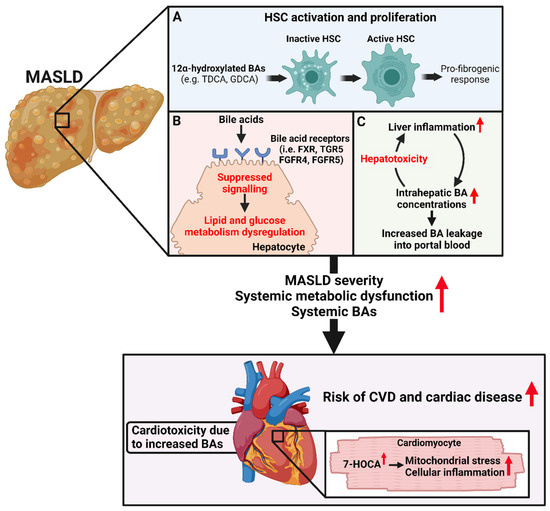 Putative roles of BAs in the pathophysiology of MASLD, CVD, and cardiac disease. In the liver, (A) 12α-hydroxylated BAs such as TDCA and GDCA have been found to induce the activation and proliferation of hepatic stellate cells and contribute to a pro-fibrogenic environment. (B) Derangements in hepatic BA signalling are thought to contribute to local and systemic perturbations in glucose and lipid metabolism, thus increasing cardiometabolic risk. (C) The presence of hepatic inflammation is thought to contribute to the impairment of hepatic BA metabolism and synthesis, leading to an increase in intrahepatic BA concentrations. These increases, especially in hydrophobic BA species such as DCA, are known to be hepatotoxic and further contribute to liver inflammation. Moreover, these increases in hepatic BA content are thought to also increase the leakage of BAs into portal blood. These hepatic effects resulting from the dysregulation of hepatic BA metabolism and signalling may exacerbate MASLD severity, systemic metabolic dysfunction, and increase systemic BA concentrations. Collectively, these factors may increase the risk of CVD and cardiac disease in patients with MASLD. Moreover, excess cardiac BAs are thought to be cardiotoxic and contribute to cardiac dysfunction. For example, increased presence of 7-HOCA in cardiomyocytes has been shown to induce mitochondrial stress and cellular inflammation. It should also be noted that derangements in BA metabolism and signalling in other tissues including the gastrointestinal system and adipose tissue are also likely to have an important role in driving MASLD, CVD, and cardiac disease risk. Black arrows indicate direction, red arrows indicate an increase. Created using BioRender.com. Abbreviations: MASLD; metabolic-dysfunction associated steatotic liver disease, BA; bile acid, TDCA; taurodeoxycholic acid, GDCA; glycodeoxycholic acid, HSC; hepatic stellate cell, FXR; farnesoid X receptor, TGR5; Takeda G protein-coupled receptor 5, FGFR4/5; fibroblast growth receptor factor 4/5, CVD; cardiovascular disease, 7-HOCA; 7α-hydroxyl-3-oxo-4-cholestenoic acid.