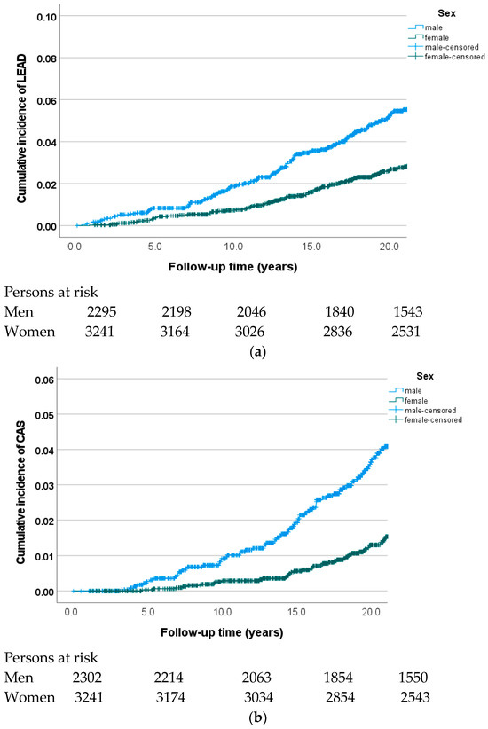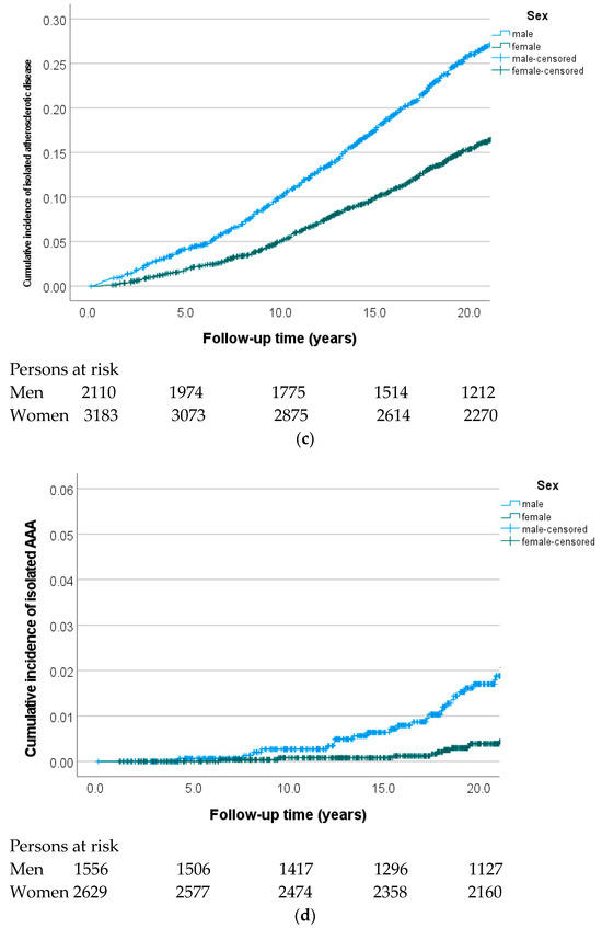 The cumulative incidence of LEAD during a median follow-up of 23.4 years (interquartile range [IQR] 19.4–24.3) was 4.4% (244/5550); 5.9% (137/2307) for men and 3.3% (107/3243) for women (p < 0.001, Figure 1a). The cumulative incidence of CAS was 2.3% (125/5543), 3.4% (75/2227) in men, and 1.5% (50/3316) in women (p < 0.001) during a median follow-up of 23.4 years (IQR 19.5–24.3) (Figure 1b). During a median follow-up of 23.1 years (IQR 16.3–24.2), the cumulative incidence of isolated AD without concomitant AAA was 22.2% (1196/5381); 28.6% (622/2178) in men and 17.9% (574/3203) in women (p < 0.001) (Figure 1c). The cumulative incidence of isolated AAA without concomitant AD was 1.6% (88/5381), and 68 (77.3%) of study subjects diagnosed with AAA were men (p < 0.001 compared to AAA in women) (Figure 1d).
