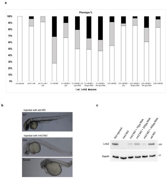 - Ren, G.; Xin, S.; Li, S.; Zhong, H.; Lin, S. Disruption of LRRK2 does not cause specific loss of dopaminergic neurons in zebrafish. PLoS ONE 2011, 6, e20630. [Google Scholar] [CrossRef] [PubMed]