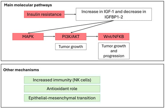 Effects of inositol on mechanisms of neoplastic development and progression. Inositol is able to inhibit the MAPK, PI3K/AKT and Wnt/NFKB pathways, both directly and through a reduction in insulin resistance. Pathways reported in red are blocked by inositol. In addition, inositol enhances immunity, reduces oxidative stress and the epithelial–mesenchymal transition. Abbreviations: IGF-1: insulin growth factor-1; IGFBP: IGF binding protein; MAPK: mitogen-activated kinase; PI3K: phosphoinositide-3 kinase; NFKB: nuclear factor kappa-light-chain-enhancer of activated B cells; NK: natural killer; Wnt: Wingless-related integration site.