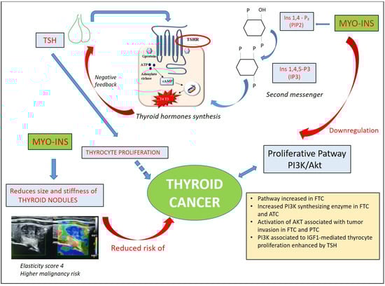 Subsequently, it is natural to think that the depletion of inositol or the impairment of its signaling pathway linked to TSH may lead to a state of hypothyroidism. Several clinical studies have demonstrated that treatment with myo-Ins plus selenium is able to significantly reduce TSH levels in patients with subclinical hypothyroidism with or without autoimmune thyroiditis and that a reduction in TSH is also associated with a decline in anti-thyroid antibodies [43]. A systematic review including 28 studies with a total of 42,032 subjects and 5786 thyroid cancer cases demonstrated that higher serum TSH concentrations are associated with an increased risk of thyroid cancer, with a probable key role of anti-thyroid antibodies [44]. A meta-analysis including 53,538 participants demonstrated that each 1 mU/L increase in serum TSH was associated with a 14% greater risk of thyroid cancer for all histological thyroid cancer, 16% for differentiated thyroid carcinoma and 22% for papillary thyroid carcinoma (PTC), but, conversely, high serum TSH was associated with a reduced risk of follicular thyroid carcinoma (FTC) [45].