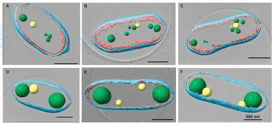 Changes in PHB granules upon chloramphenicol (Cm) treatment. Rba. sphaeroides cultures grown in Sistrom’s minimal medium with succinate as the carbon source. The culture was split in half, and one portion was untreated, i.e., no antibiotics (A–C) or treated with 200 μg/mL Cm (D–F). Central slices through tomographic reconstructions of cells in progressive stages of the cell cycle along with the presence of PHB granules and PP granules. Upon Cm treatment (D–F), PHB granules increased significantly in size compared to PHB granules in untreated cells (A–C). Segmentation models for each cell are overlaid onto the tomogram. The model depicts the inner (red) and outer (cyan) membranes as well as PHB (green) and PP (yellow) granules. Scale bars are 500 nm.